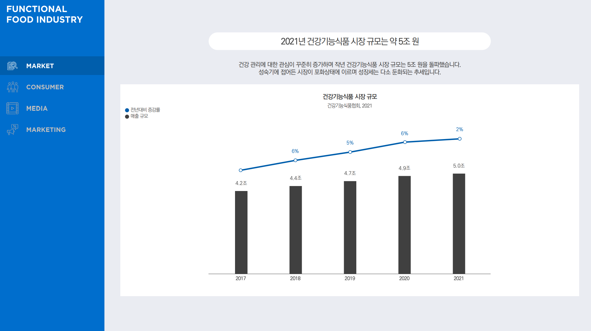 건기식 시장은 2021년 5조 원에 달성하였으며, 성장세는 둔화된 모습을 보이고 있다.