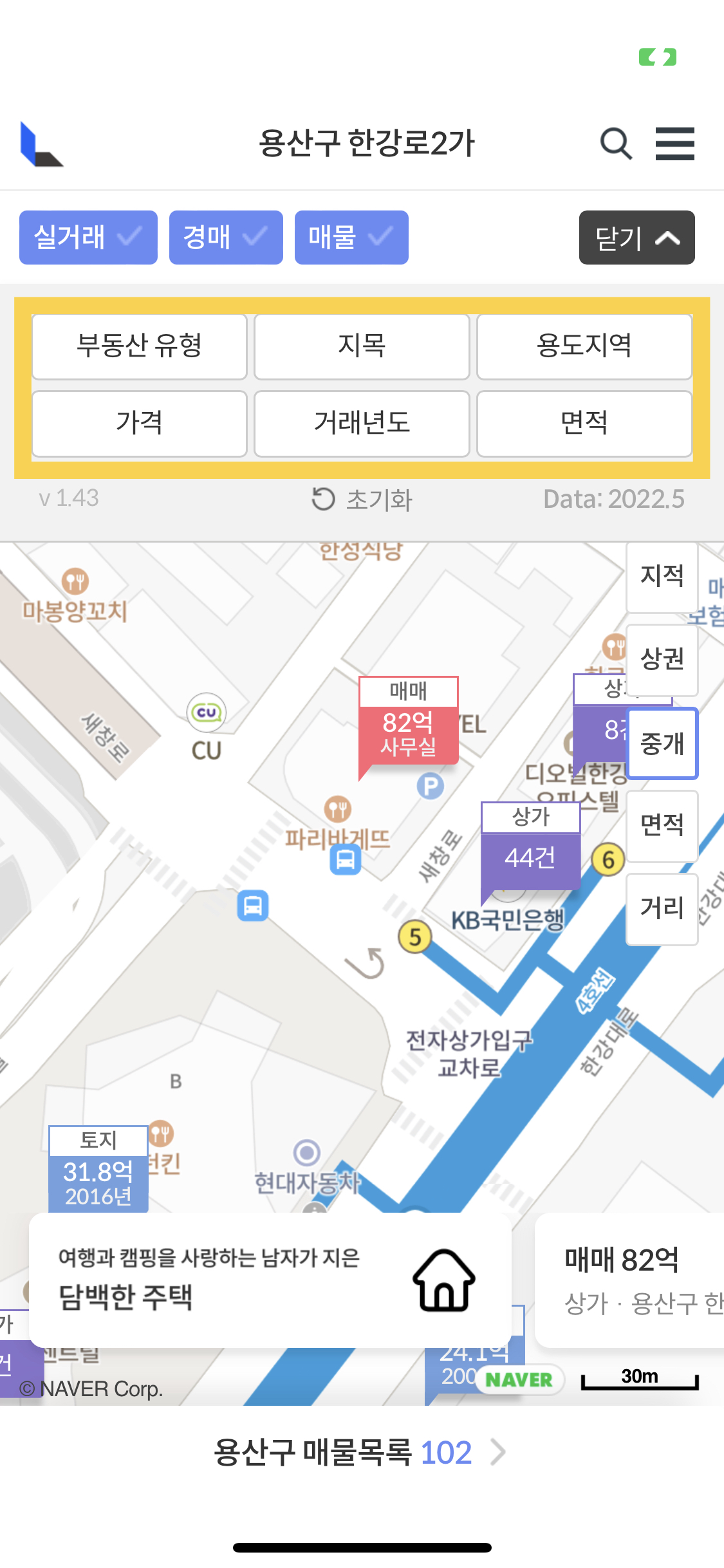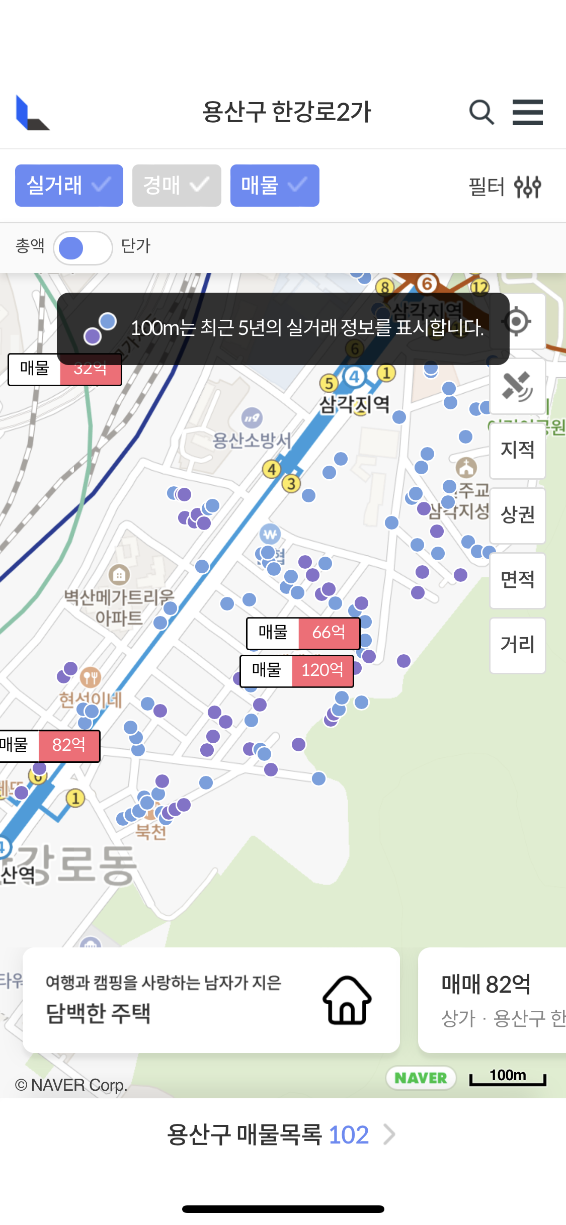 밸류맵은 매물을 수많은 실거래가 속에서 색상과 그래픽에 차이를 둬 눈에 뛰게한다.