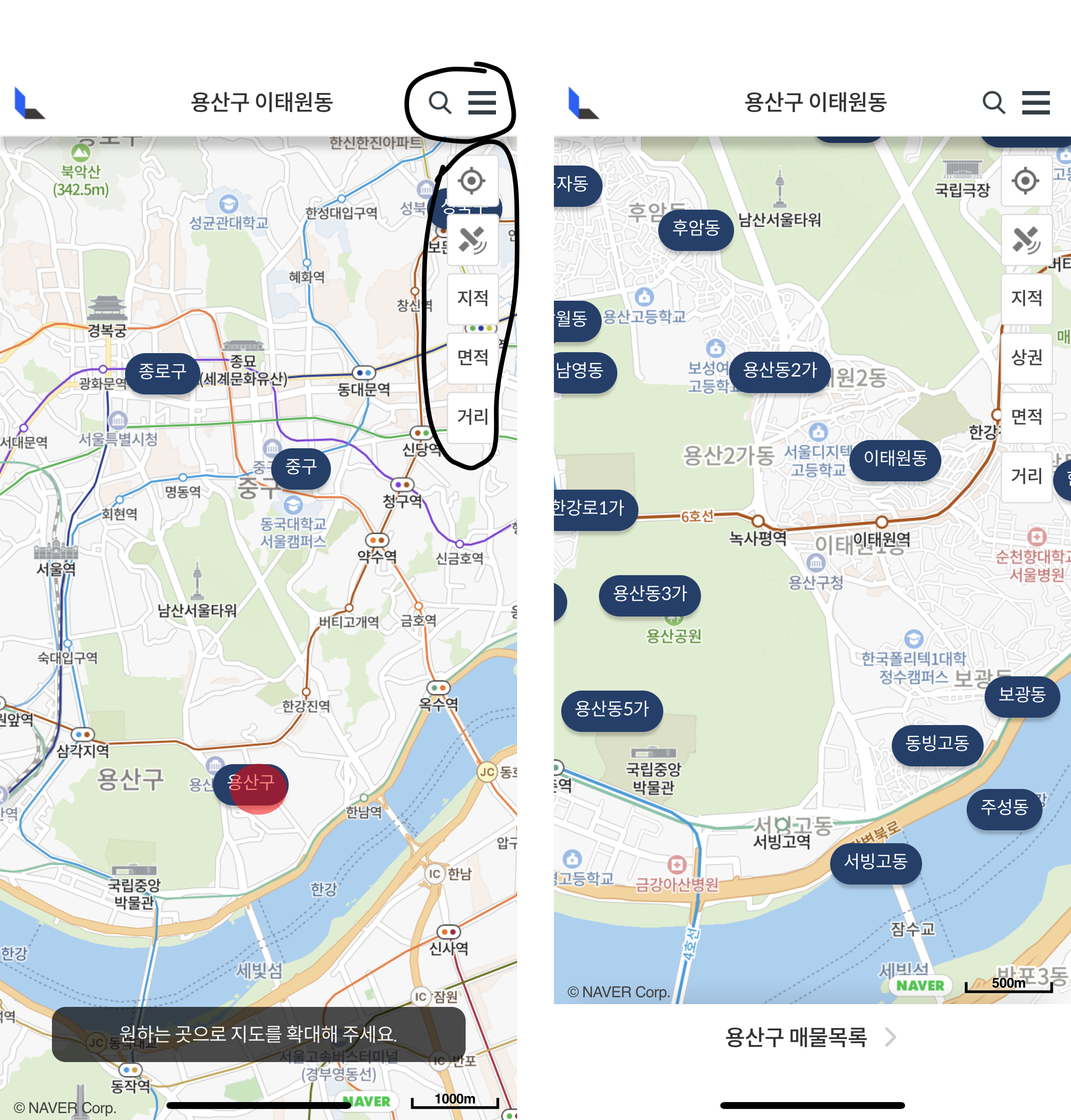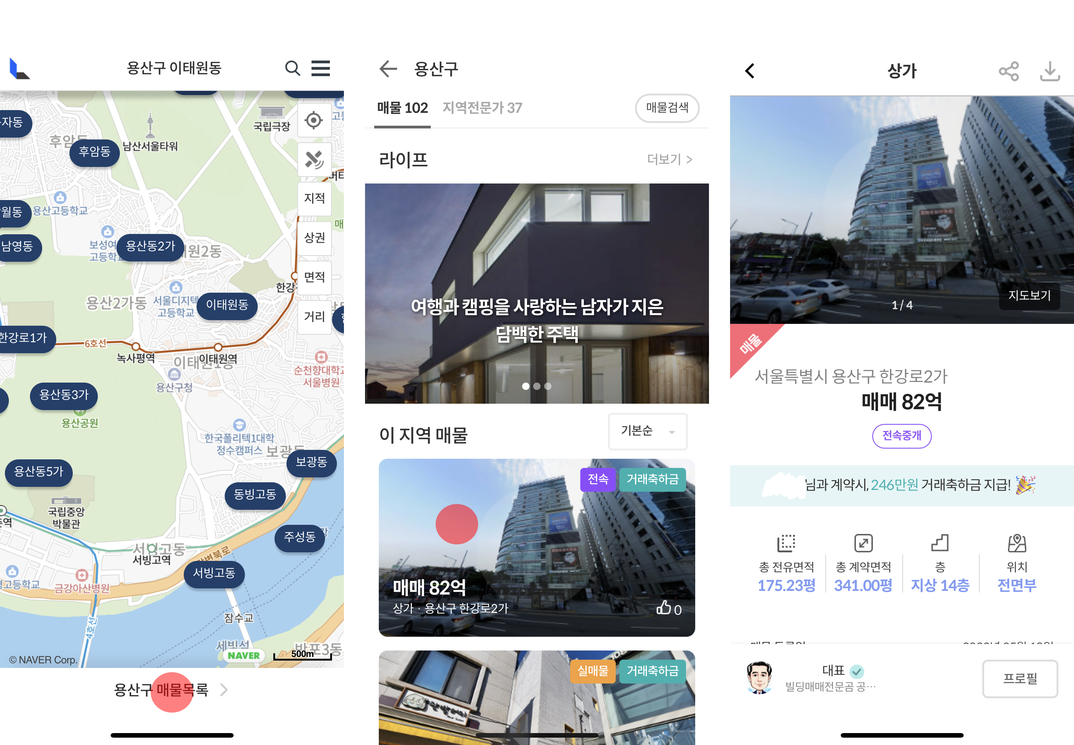 밸류맵은 피츠의 법칙을 통해 메인 화면에서 현재 보고 있는 장소의 매물들을 빠르게 확인 할수 있도록 맨 아래 '매물목록'을 만들어 놓았다. 또한, 매물의 큰 이미지를 볼수있으며, 이미지를 누르면 매물의 정보와 매매를 담당하고 있는 공인중개사를 확인하고 연락이 가능하다.