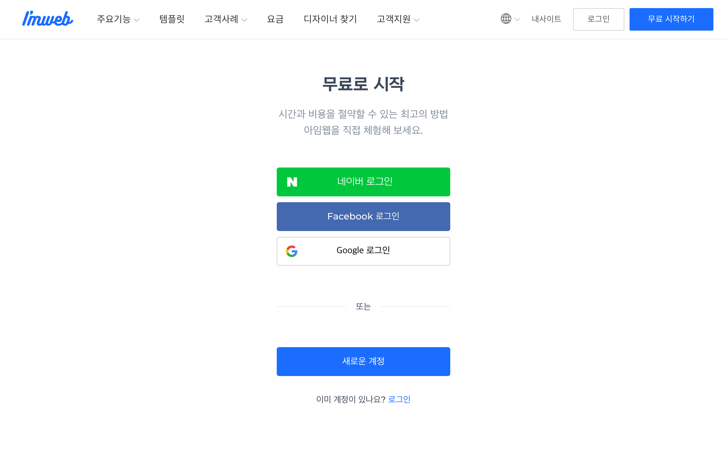 아임웹은 하얀색의 배경색으로 눈에 띄게 고정 CTA 카피인 '로그인'과 '무료 시작하기'을 어필하고 있으며,
