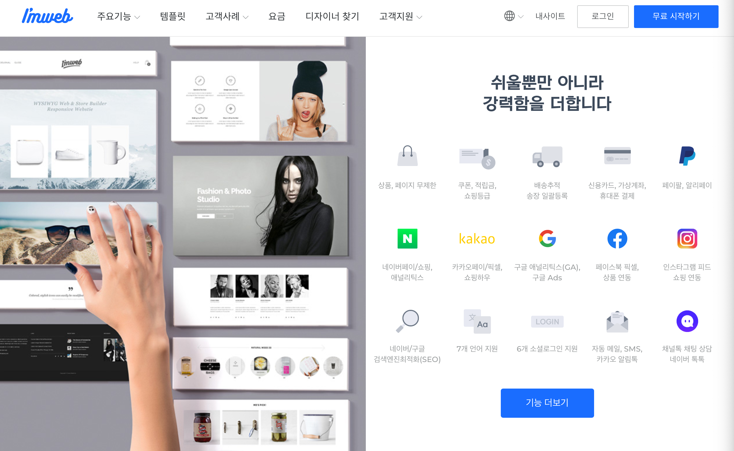 아임웹의 간편 결제, SNS 연동, SEO 최적화등 다양한 기능을 어필하고 있다.