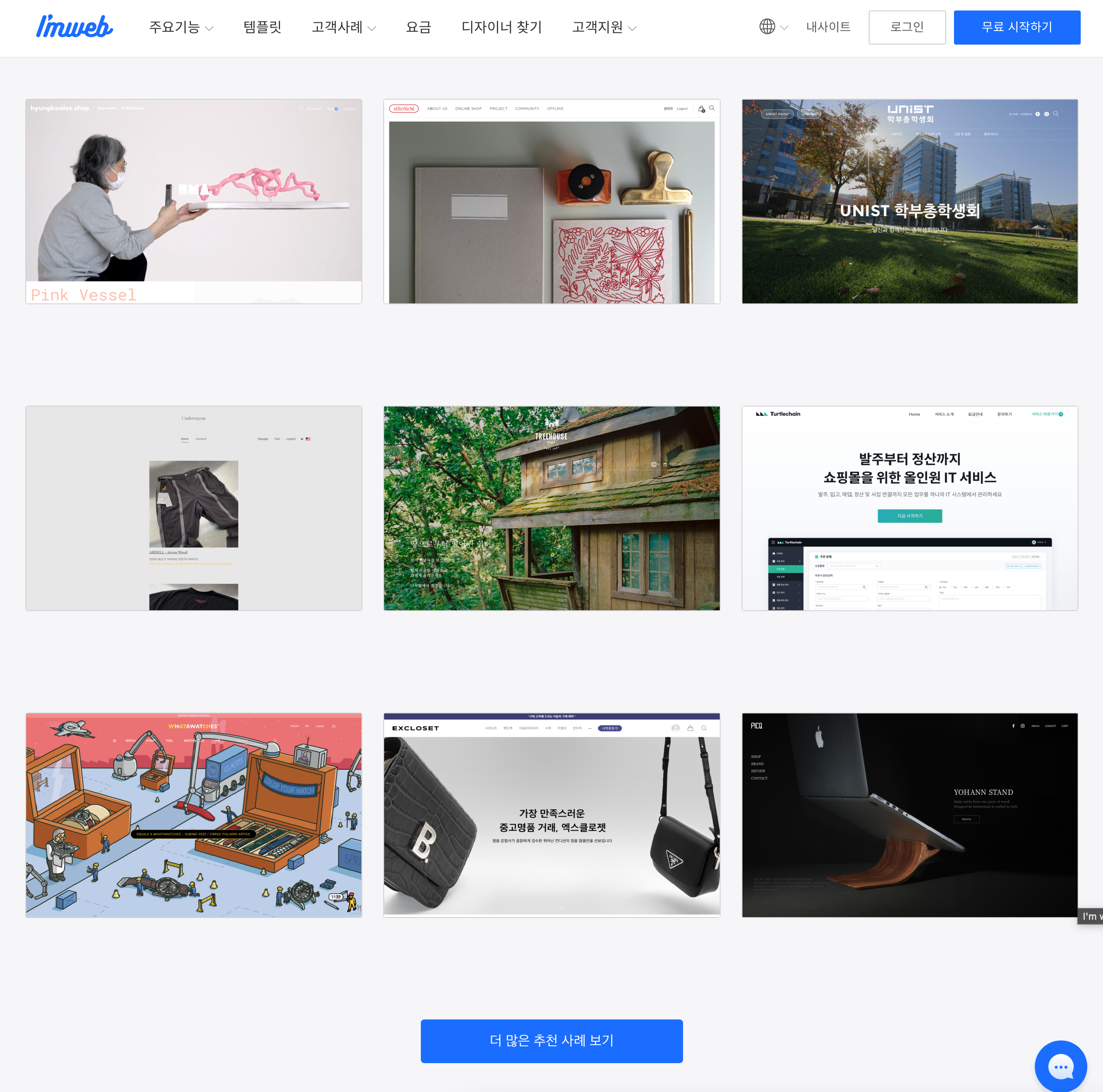 아임웹을 통해 제작한 웹사이트들을 소개하고 있다.
