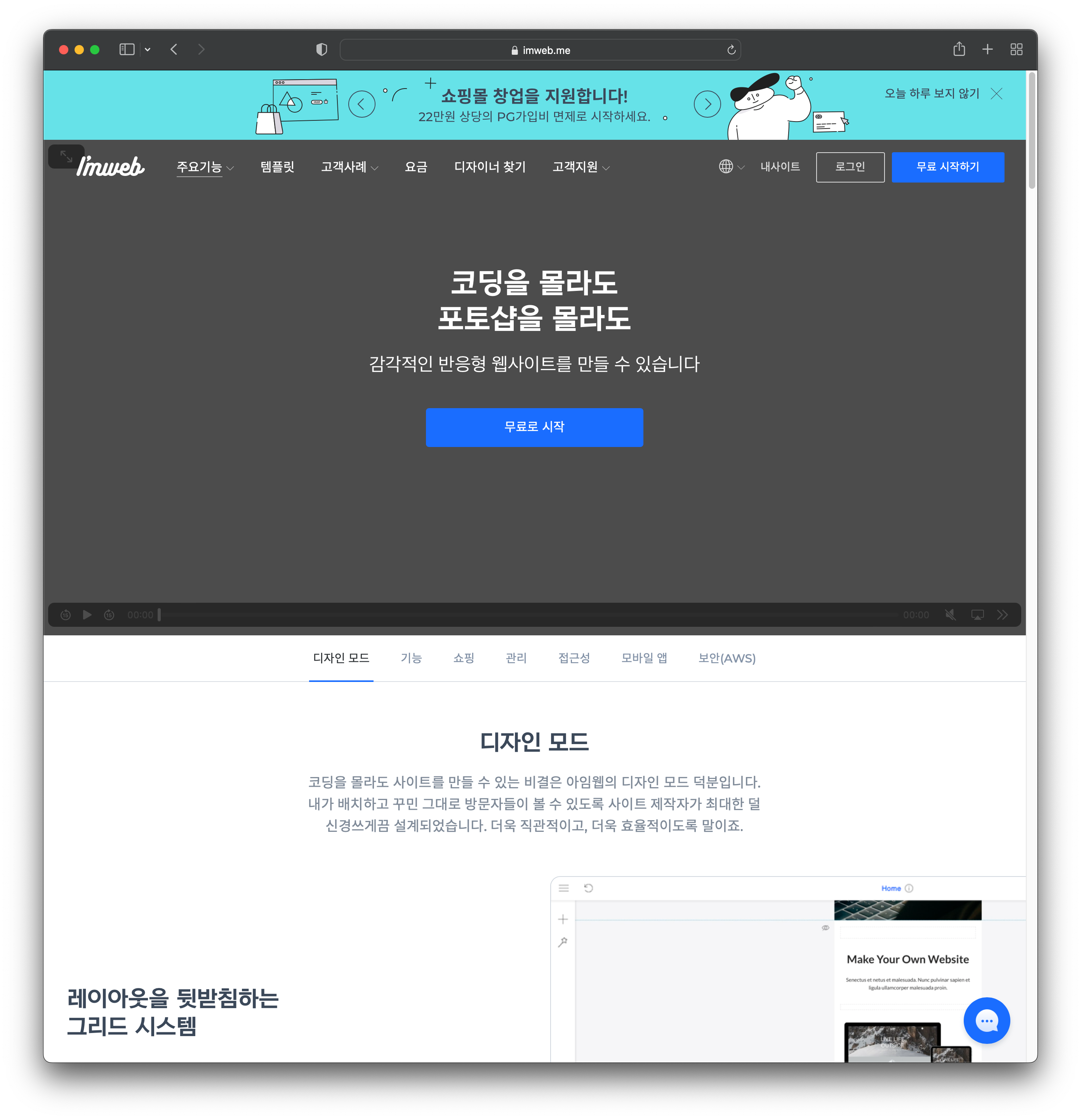 메인화면 중 가장 넓은 면적을 차지하는 아임웹을 소개하는 영상.