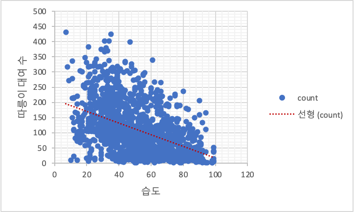 먼저 데이터의 수가 약1500개라서 분포도로 시각화 하였습니다. 시각화된 데이터의 추세선을 보면 습도가 높아짐에 따라 따릉이 대여수가 줄어드는 것으로 보아, 가설과 일치하다고 할수있습니다.
