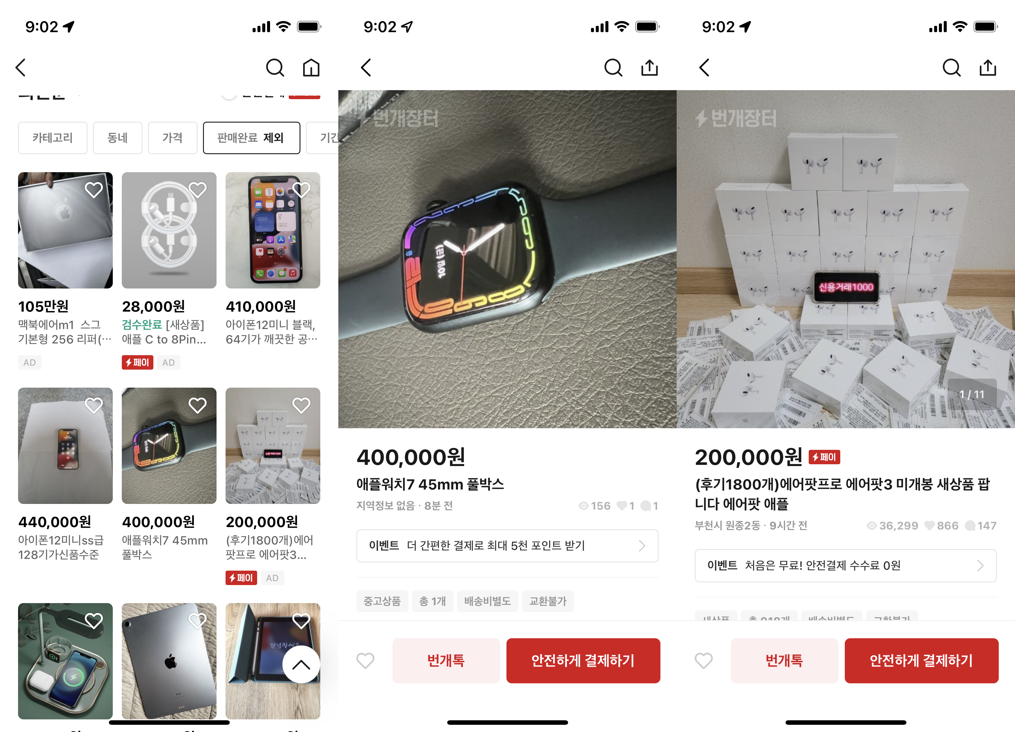 번개페이의 강점으로 뽑은 쉽고 빠른 UX는 상품목록들을 보면 알 수 있다. 번개페이의 아이콘이 붙어 있는 상품들이 그렇지 않은것보다 눈에 잘보이는것을 알수있다. 또한 번개페이 아이콘이 붙어 있는 상품은 '구매자가 상품을 받아보고 구매확정을 누르기 전까지 돈이 안전하게 번개장터에 보관되어 있는것이기에 판매자의 신뢰를 판단할때 리뷰, 별점, 신고이력과 판매내역등을 굳이 확인하지 않아도 사기로부터 안전하다는것을 알수있다'. 따라서 구매자가 번개페이 미지원 상품보다 지원 상품을 더욱더 짧은 시간안에 구매를 결정할거라 생각한다.
